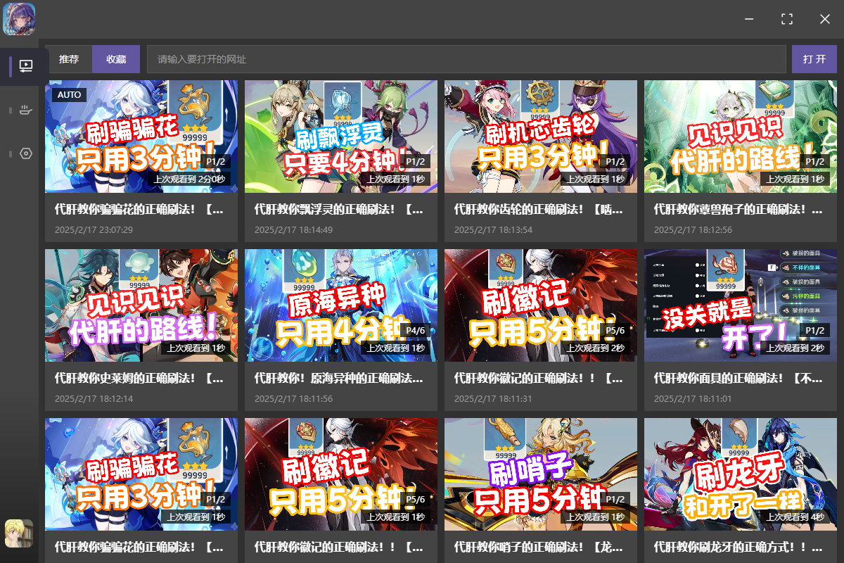 - 收藏:收藏页面会展示用户手动收藏和自动收藏的视频。自动收藏的视频左上角会显示「AUTO」标识,且自动收藏在列表中仅保留一个。开启自动收藏功能后,关闭 Bilibili 视频窗口时会触发自动收藏逻辑,其他页面(如 B 站首页、搜索页等)不触发。手动收藏最多显示 20 条记录,自动收藏也算作一个收藏位,手动收藏对收藏页面类型无限制。